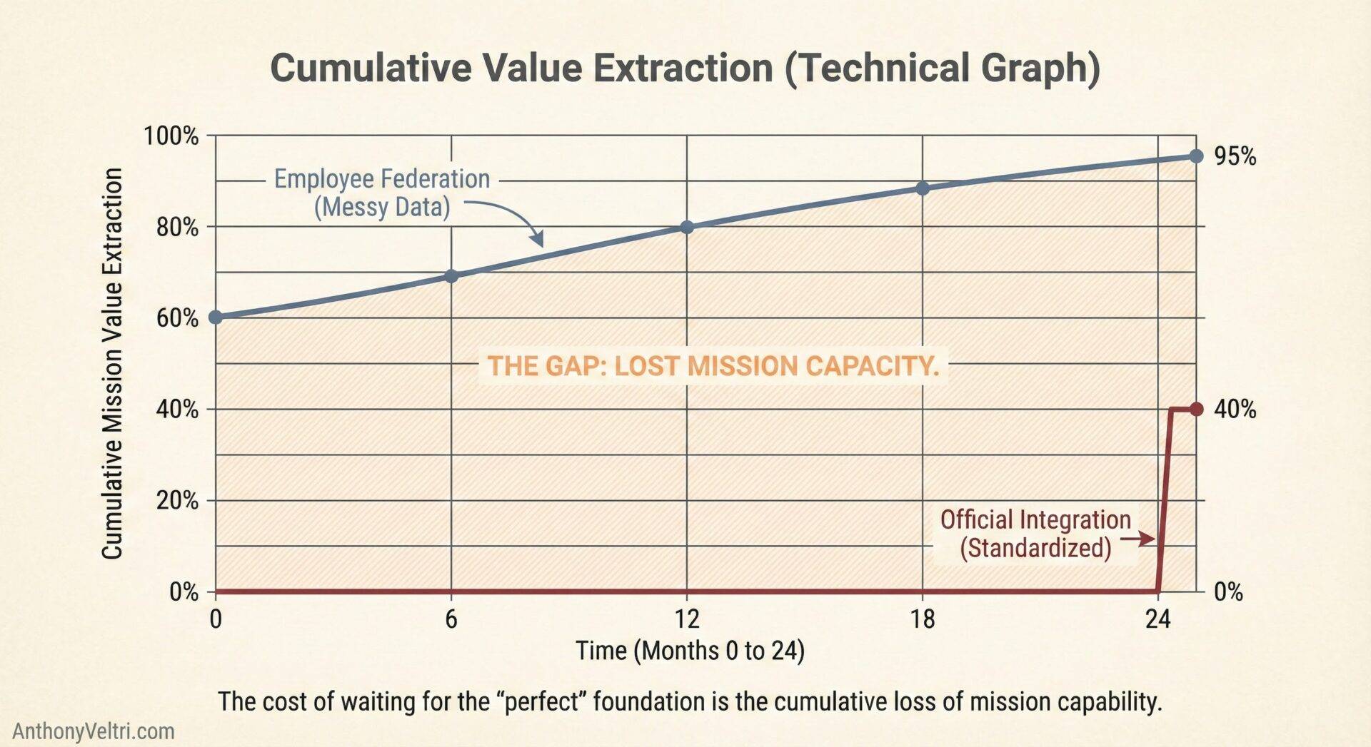 - AI advancement rate exceeds organizational standardization rate. The temporal math is decisive: you can’t amortize 24 months of preparation across 6 months of technology relevance. This results in 400% cost overrun measured against technology lifespan.