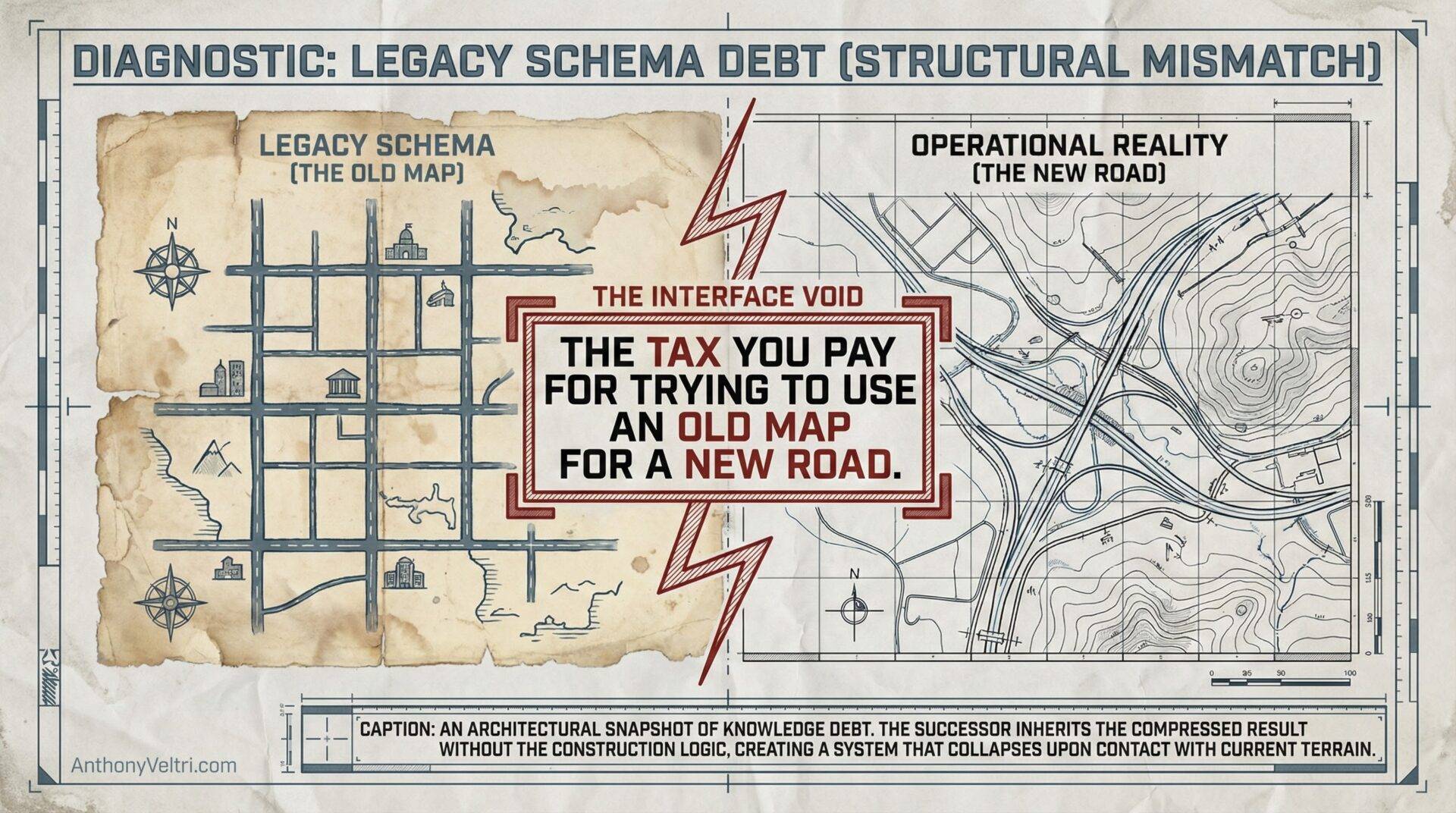 The Interface Void is the primary driver of Legacy Schema Debt. This occurs when a predecessor leaves behind a “Compressed” result (the SOP, the spreadsheet, the model) without leaving the “Construction” logic (the why and the how).