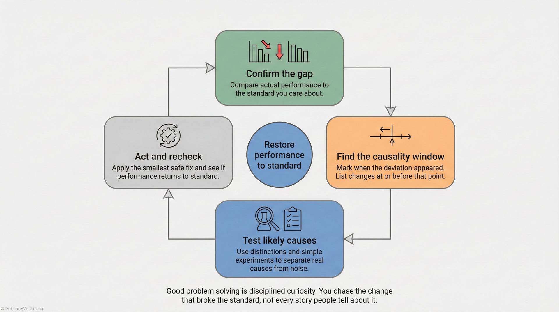 “Most problems teams chase are symptoms, not causes. I look for the real deviation and the relevant change. When you connect those two, the true problem becomes clear and the solution becomes simple.”