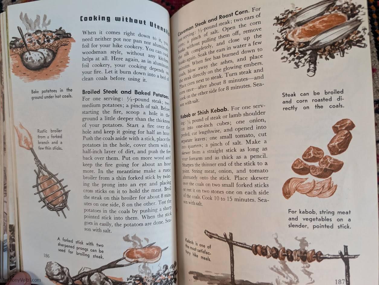 She wants to learn how to light a fire with a friction bow and how to cook over coals. There are sections in that 1960s Norman Rockwell handbook that show exactly that. She doesn’t need to read the whole handbook. She needs those two sections, right now, for this specific purpose.